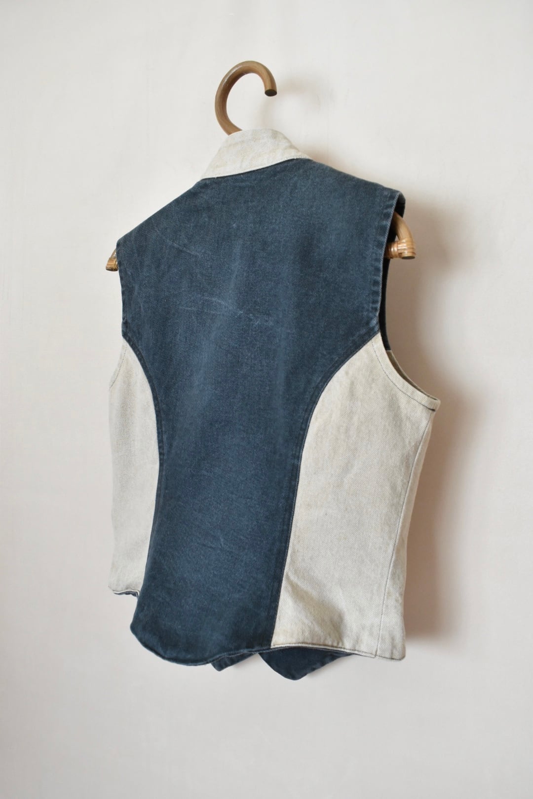深くくびれの入ったデニムパターンベスト。