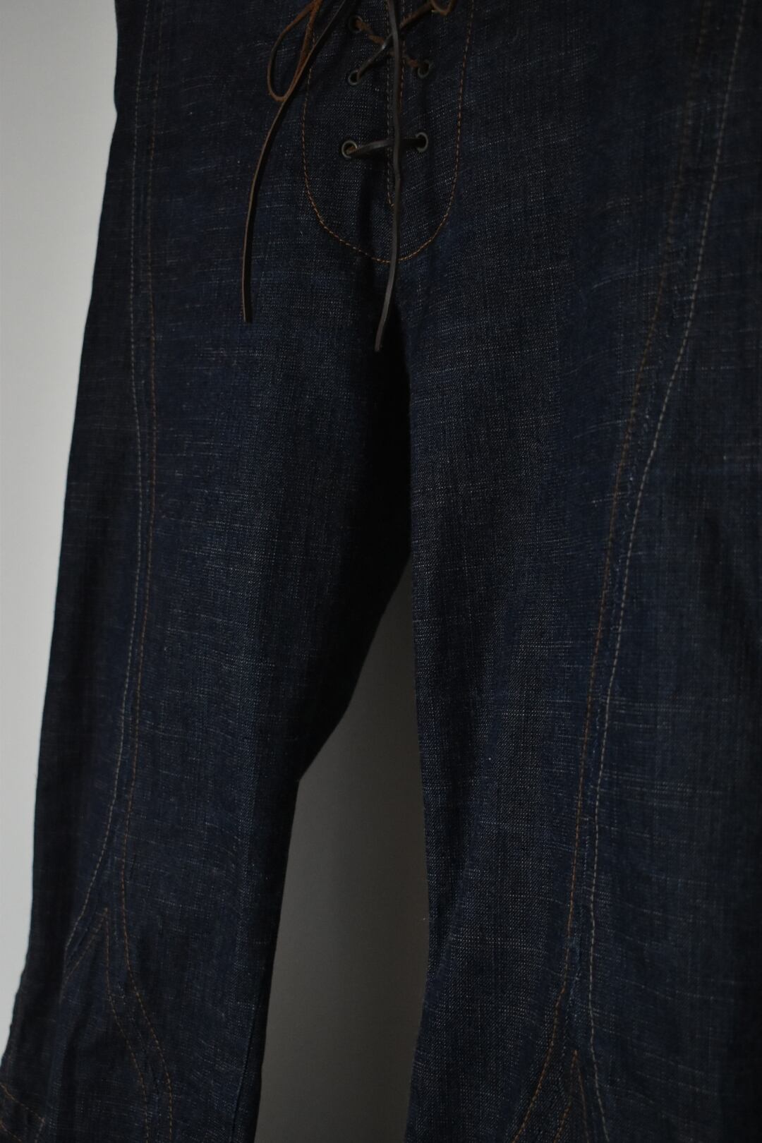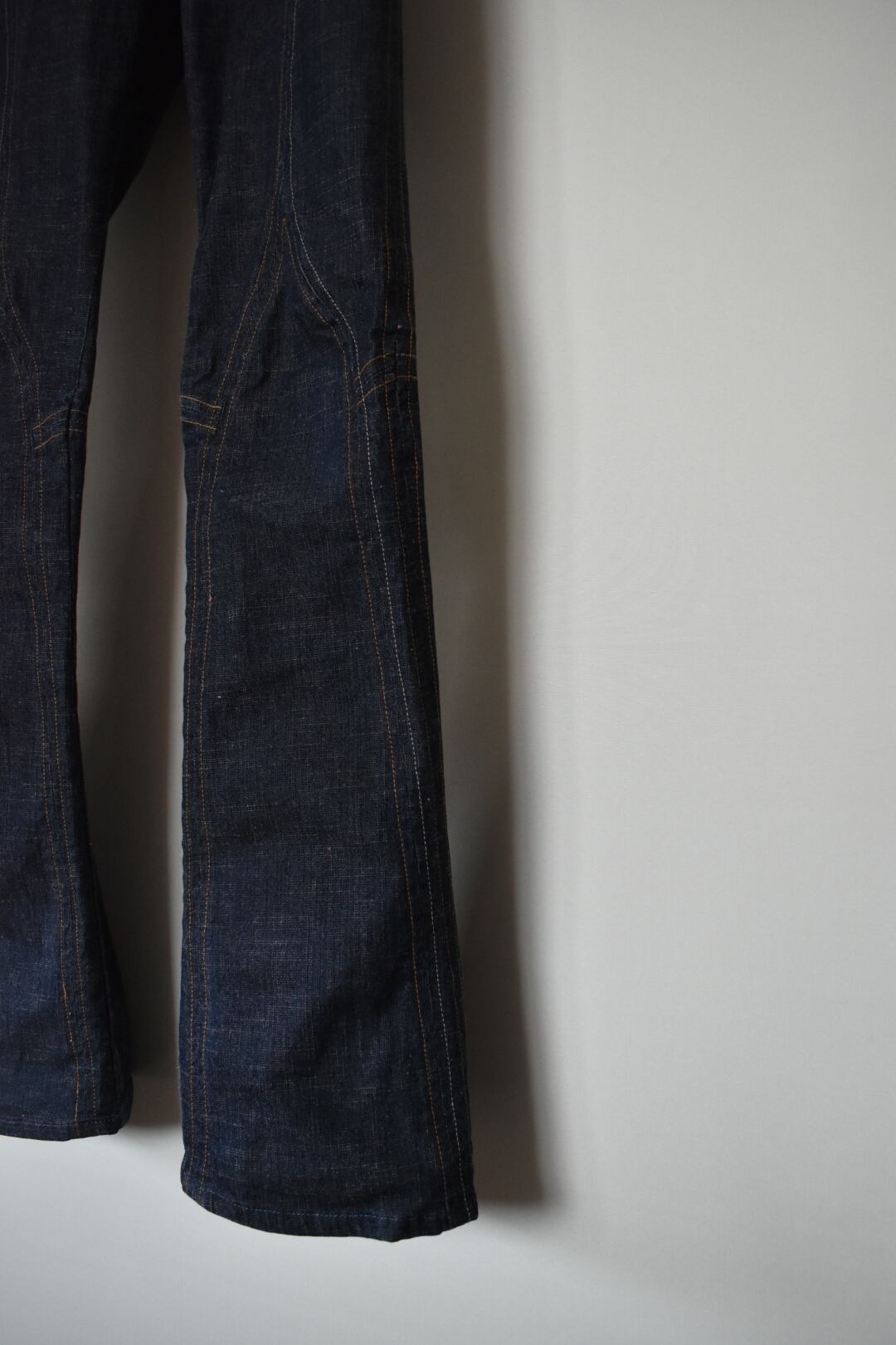 膝を避けるようにカーブされる縦のステッチと、膝裏を真横に通る横向きのステッチがあることによって、着用したときに美しい立体感が現れます。