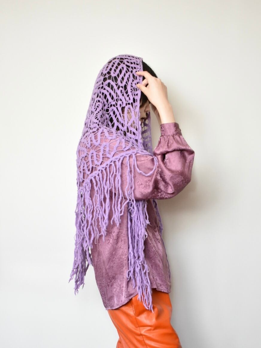 緻密に編まれたフラワーモチーフがキュートですが、どことなく毒っ気も存在するショールです。
