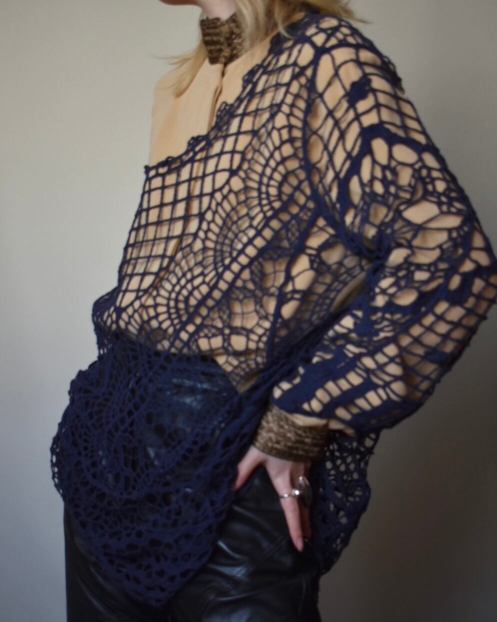ネックとカフス部分に緻密な編み