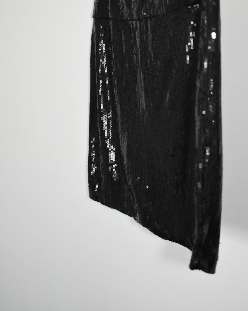 一見派手になりがちですが、スパンコールひとつひとつの反射は控えめで、ベーシックカラーのブラックが故にいろんなアイテムの相性を底上げしてくれるような一点です。