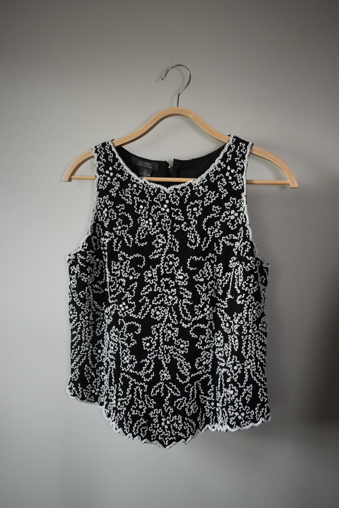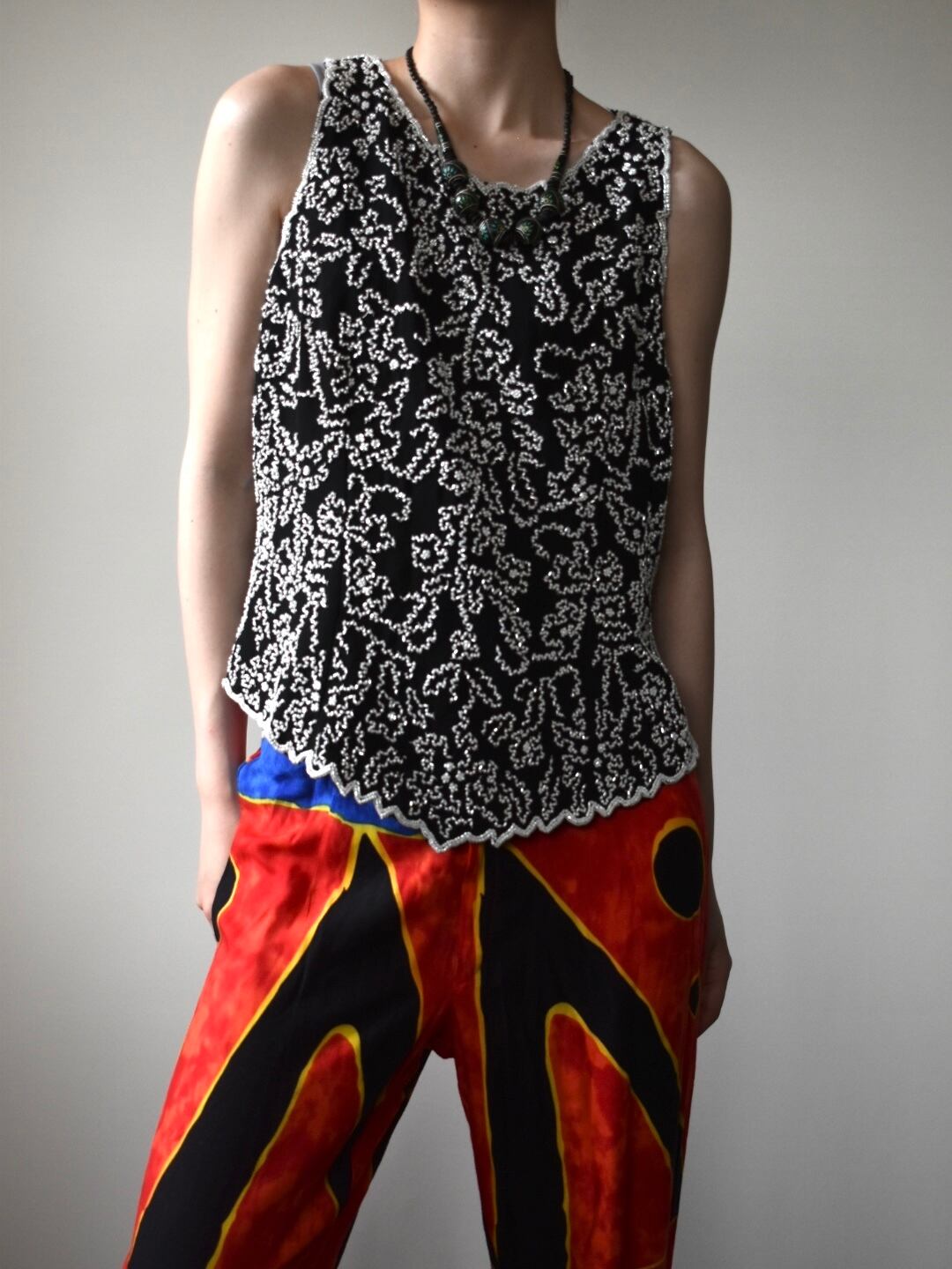 ホワイトとブラックの単調なカラーですが、ビーズのきらめきが全面に走ることで一枚で主役級の可愛さを発揮します